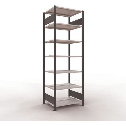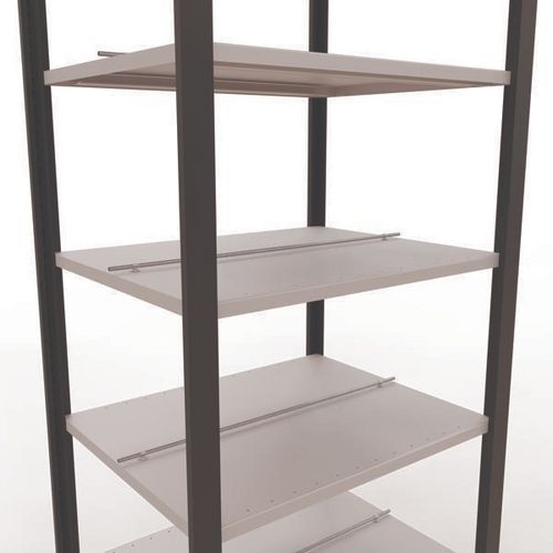 Rayonnage bureau de belle finition pour charge légère. Tablette pleine tôlée pour toutes natures d'objets. Butée centrale pour délimitation de chaque face. Montant plein tôlé sans perforation face avant. Pied de protection pour préserver les sols. Montage sans outils, par système de clip.