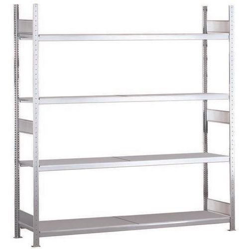 Solide rayonnage d'entrepôt à niveau plein acier tôlé. Stable sans croisillon, accessible d'un côté et de l'autre. Parfait en combinaison avec d’autres rayonnages Easy-Fix. Haute résistance à la corrosion avec finition acier galvanisé.