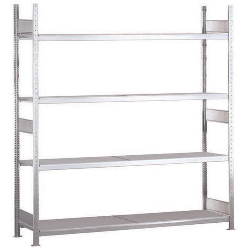 Solide rayonnage d'entrepôt à niveau plein acier tôlé. Stable sans croisillon, accessible d'un côté et de l'autre. Parfait en combinaison avec d’autres rayonnages Easy-Fix. Haute résistance à la corrosion avec finition acier galvanisé.