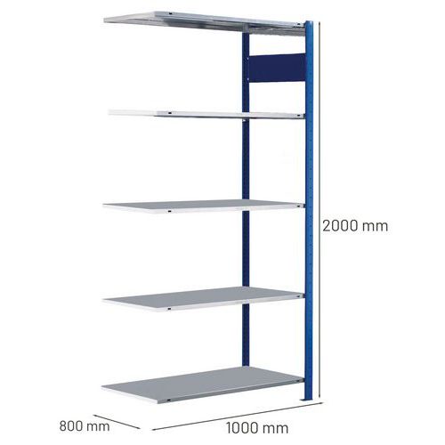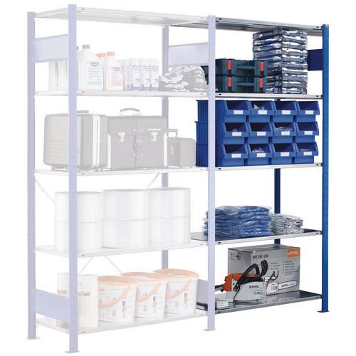 Système de rayonnage robuste et très complet avec belle finition peinte époxy, gris ou bleu. Tablettes pleines acier tôlé pouvant supporter des marchandises de multiples dimensions. Étagère industrielle facile et rapide à monter par emboîtement, sans outillage particulier. Extension de rayonnage aisée avec l'adjonction de 1 ou plusieurs éléments suivants.