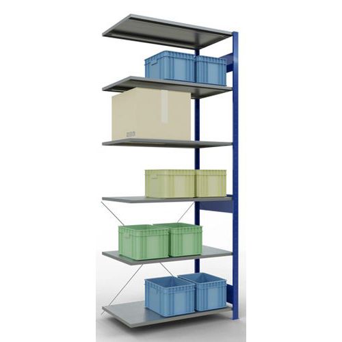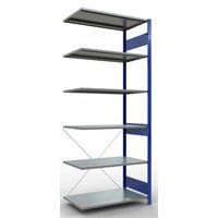 Système de rayonnage robuste et très complet avec belle finition peinte époxy, gris ou bleu. Tablettes pleines acier tôlé pouvant supporter des marchandises de multiples dimensions. Étagère industrielle facile et rapide à monter par emboîtement, sans outillage particulier. Extension de rayonnage aisée avec l'adjonction de 1 ou plusieurs éléments suivants.