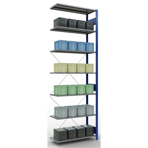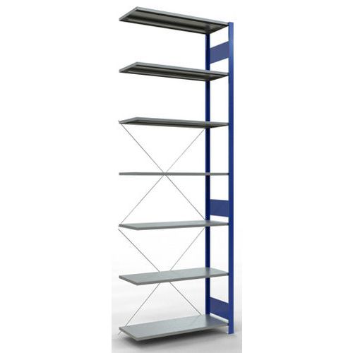 Système de rayonnage robuste et très complet avec belle finition peinte époxy, gris ou bleu. Tablettes pleines acier tôlé pouvant supporter des marchandises de multiples dimensions. Étagère industrielle facile et rapide à monter par emboîtement, sans outillage particulier. Extension de rayonnage aisée avec l'adjonction de 1 ou plusieurs éléments suivants.