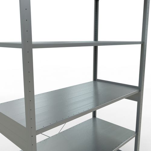 Rayonnage d'entrepôt robuste, finition galva ultra-résistante aux environnements humides. Tablettes pleines acier tôlé pouvant supporter des marchandises de multiples dimensions. Étagère industrielle facile et rapide à monter par emboîtement, sans outillage particulier. Extension de rayonnage aisée avec l'adjonction de 1 ou plusieurs éléments suivants. Distance entre les perforations : 25 mm. Hauteur de la première perforation : 50 mm.