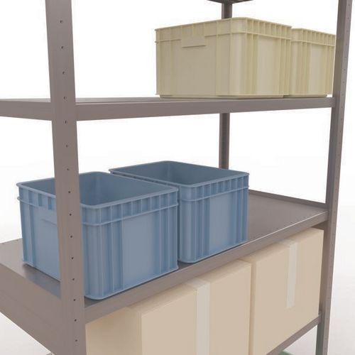 Rayonnage d'entrepôt robuste, finition galva ultra-résistante aux environnements humides. Tablettes pleines acier tôlé pouvant supporter des marchandises de multiples dimensions. Étagère industrielle facile et rapide à monter par emboîtement, sans outillage particulier. Extension de rayonnage aisée avec l'adjonction de 1 ou plusieurs éléments suivants. Distance entre les perforations : 25 mm. Hauteur de la première perforation : 50 mm.