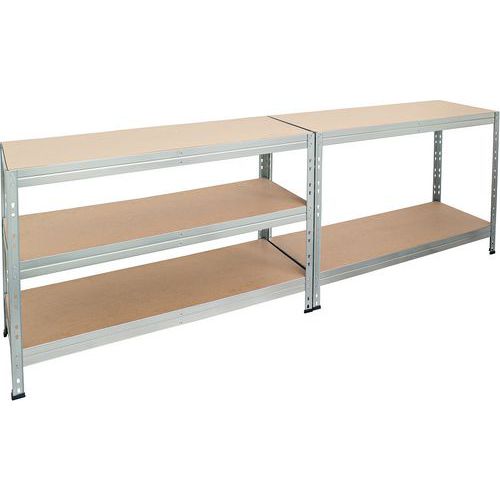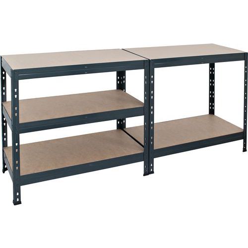 Rayonnage industriel pour le stockage des charges légères à moyennes avec 250 kg par niveau. Robuste : fixation sûre des lisses par double rivetage, 2 renforts par niveau sous le plateau. Proposé en plusieurs dimensions et 3 finitions de qualité (peinture époxy ou acier zingué). Rayonnage modulable au montage : 1 travée haute ou 2 travées bsses côte à côte. RAL coloris : bleu 5010, anthracite 7016. Plateau aggloméré HDF, très haute densité. Étagère d'entrepôt de montage très aisé, ne nécessitant pas d'outils spécifiques.