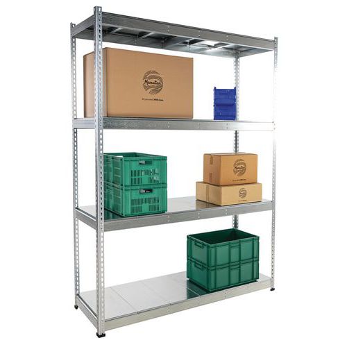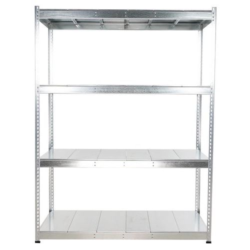 Rayonnage industriel simple et ultra-robuste pour stockage des marchandises de charge lourde. Tablette pleine acier parfaite pour l'entrepôt des pièces en vrac et/ou des produits graisseux. Finition zinguée pour zone humide ou peinture époxy gris/bleu pour environnement sec. Étagère d'entrepôt de montage facile, sans l'aide de techniciens et d'outils spécifiques.