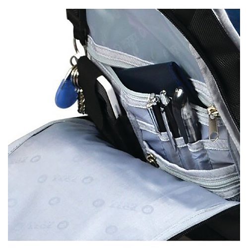 Dispose également d’une poche secrète dorsale zippée anti-RFID (blocage des ondes via une couche d'aluminium créant une cage de Faraday).