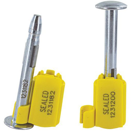 | Intitulé du produit | Scellé double numérotation pour conteneur, Coloris: Jaune, Longueur hors tout: 79 mm, Tige Ø: 8 mm |