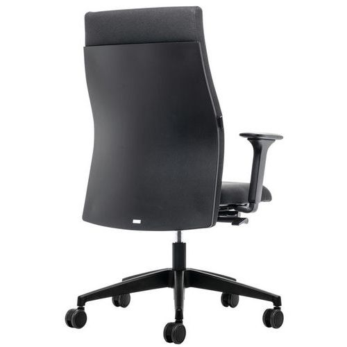 Siège de bureau pivotant avec dossier haut rembourré. Système sur mécanisme synchrone avec réglage automatique de tension. Soutien lombaire réglable en hauteur. Accoudoirs en T 4D pour soulager la musculature du cou et de la nuque. Blocable en position avant et arrière pour plus de flexibilité.