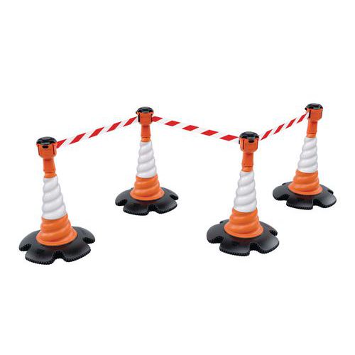 Chaque unité est équipée de 9 mètres de ruban en tissu de haute qualité rétractable rouge/blanc ou jaune/noir.