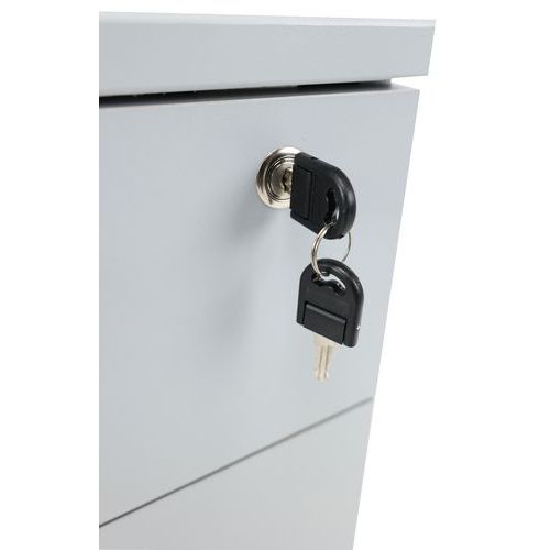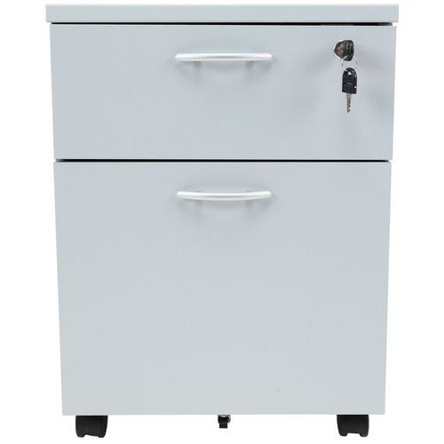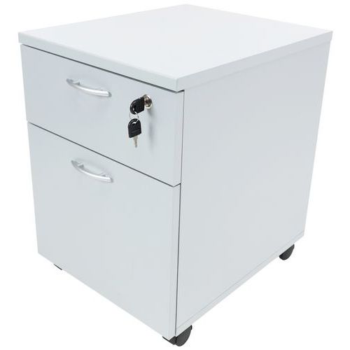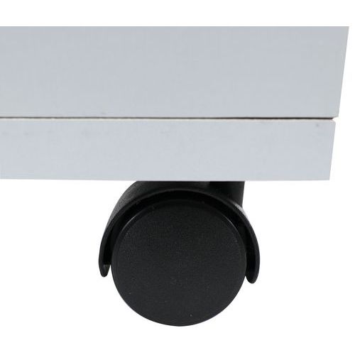 Caisson avec tiroirs en panneaux de particules surfacés mélaminés. Mobilier équipé de roulettes anti-basculement. Verrouillage avec serrure à cylindre (1 seul tiroir). Un programme efficace et robuste d’une installation aisée