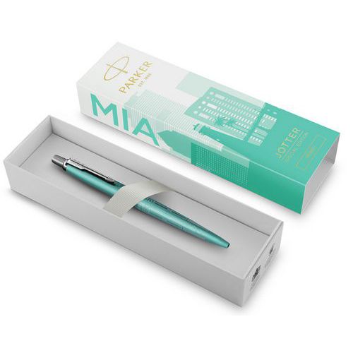 Également compatible avec les recharges gel Parker. Rouge Londres, Indigo Séoul, Miami Turquoise, Paris gris bleu avec finition chrome. Pointe moyenne. Encre bleue. Coffret cadeau géométrique.
