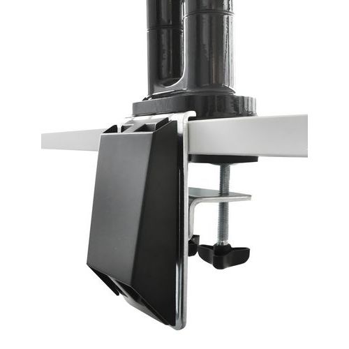 Support écran ergonomique à ressort bras double, système Quick Release pour accrocher et décrocher facilement les écrans.