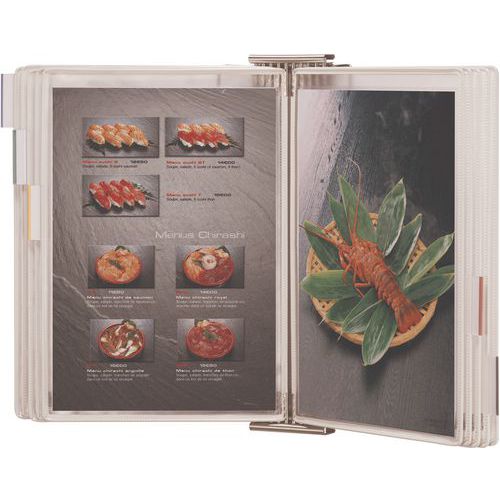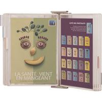 Composition : - 1 élément mural (gris clair ou inox) - 10 pochettes à pivot - 5 cavaliers (inserts neutres/couleur) - Fixation murale (vis, chevilles et entretoises)