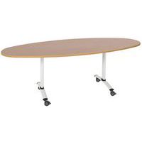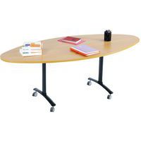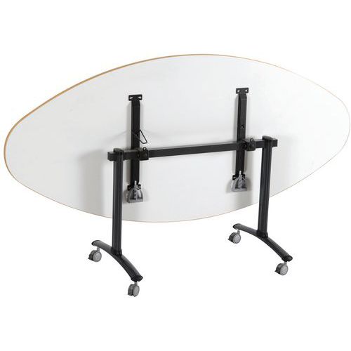 Table de réunion ovale pliante Axe avec plateau pivotant permettant un gain de place pour le rangement. Verrouillage automatique du plateau en position travail (horizontal) et position verticale (stockage) . Système de liaison rapide entre les plateaux par vis molette. Equipée de 4 roulettes Ø 75 mm avec frein.Table de réunion ovale pliante Axe avec plateau pivotant permettant un gain de place pour le rangement. Verrouillage automatique du plateau en position travail (horizontal) et position verticale (stockage) . Système de liaison rapide entre les plateaux par vis molette. Equipée de 4 roulettes Ø 75 mm avec frein. Chants ABS épaisseur 2 mm. Piètement métal laqué époxy. Fabriquée en France Livrée pieds démontés.