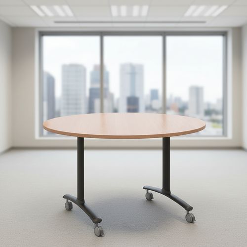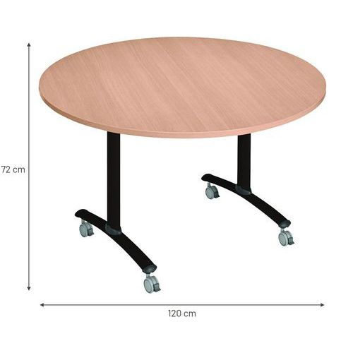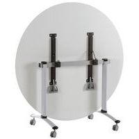 Table de réunion ronde pliante Axe avec plateau pivotant permettant un gain de place pour le rangement. Verrouillage automatique du plateau en position travail (horizontal) et position verticale (stockage) . Système de liaison rapide entre les plateaux par vis molette. Equipée de 4 roulettes Ø 75 mm avec frein.Table de réunion ronde pliante Axe avec plateau pivotant permettant un gain de place pour le rangement. Verrouillage automatique du plateau en position travail (horizontal) et position verticale (stockage) . Système de liaison rapide entre les plateaux par vis molette. Equipée de 4 roulettes Ø 75 mm avec frein. Chants ABS épaisseur 2 mm. Piètement métal laqué époxy. Fabriquée en France. Livrée pieds démontés.