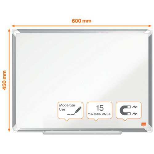 Tableau en acier laqué Premium Plus. Surface en acier laqué magnétique avec cadre moderne en aluminium. Un grand auget qui permet de ranger facilement les marqueurs, les effaceurs ou autres accessoires pour tableau blanc. Bon niveau d'effaçabilité pour une utlisation fréquente. Certifié EU EcoLabel, ce produit garantit un impact environnemental réduit à chaque étape de son cycle de vie, tout en répondant à des critères stricts de qualité et de durabilité. Magnétique