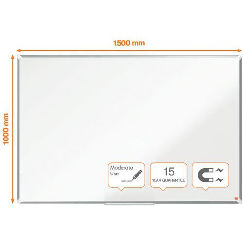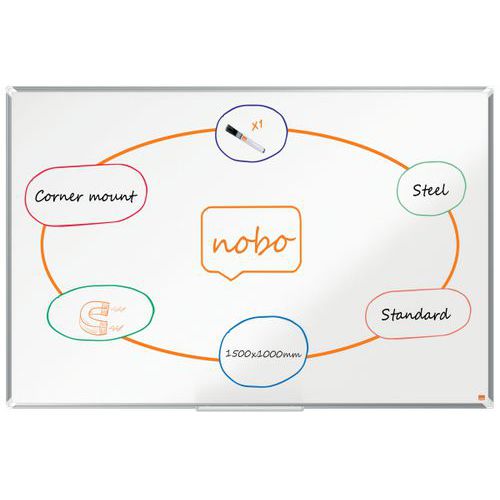Tableau en acier laqué Premium Plus. Surface en acier laqué magnétique avec cadre moderne en aluminium. Un grand auget qui permet de ranger facilement les marqueurs, les effaceurs ou autres accessoires pour tableau blanc. Bon niveau d'effaçabilité pour une utlisation fréquente. Certifié EU EcoLabel, ce produit garantit un impact environnemental réduit à chaque étape de son cycle de vie, tout en répondant à des critères stricts de qualité et de durabilité. Magnétique