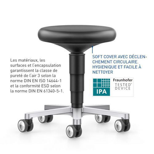 | Intitulé du produit | Tabouret salles blanches sur roulettes, Type de piétement: 5 pieds, Siège modèle: Bas, Repose-pieds: non |
