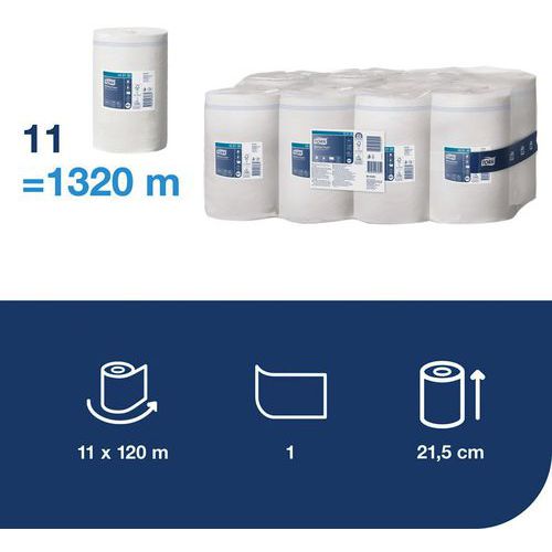 Mini bobine d'essuyage Tork Plus M1 multi-usages. Emballage ergonomique en carton facile à transporter, à ouvrir et à jeter. Essuie-mains à absorption élevée résistant à l'humidité. Séchage hygiénique des mains avec sensation agréable au toucher.