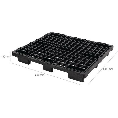 Transpalette manuel avec fourche de longueur 1150 mm avec hâssis en acier ultrarésistant, pour un usage intensif. Timon confortable revêtu de caoutchouc et levier 3 positions : levage, position neutre et descente. Équipé de roues directionnelles et de roues à fourche tandem en polyuréthane. Livré avec 15 palettes légères emboîtables 1200x1000 mm, ergonomiques, légères et fabriquées en matériau recyclé, non poreux. Construction des palettes entièrement monobloc, ultra hygiéniques : lavables au nettoyeur haute pression et désinfectables (moulées en 1 seule pièce). Palettes PEhd recyclé 6 entrées, 9 plots, idéales pour l'industrie pharmaceutique, agroalimentaire et la grande distribution