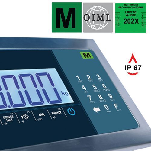 | Fonctions | Pesage, tarage, comptage, totalisation manuelle ou automatique, tabulation directe de la tare, mémorisation de 5 tares, contrôle +/- avec indication visuelle (orange-vert-rouge), sortie RS232. |