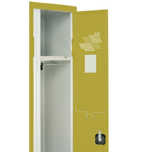 Vestiaire en tôle d'acier 1er choix, de belle rigidité, indéformable. Tôle d'acier 6/1e profilée (équivaut à pliage standard 8/1e). Colonnes soudées entre elles pour une plus grande solidité. Excellente résistance mécanique avec profil fermé agrafé. Porte indégondable ouverte ou fermée, antieffraction. Articulation sur charnières avec ouverture à 18°. Armoire vestiaire avec porte-étiquette embouti. Alliez résistance, sécurité, esthétique pour vos espaces collectifs !