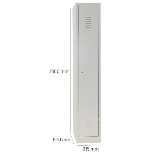 Vestiaire acier robuste à portes renforcées. Ouverture optimale à 180° et charnières invisibles. Hygiénique avec une aération haute et basse des portes. Perforations pour accroche murale, porte-étiquette embouti.