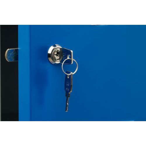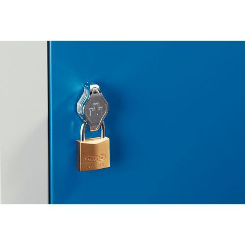 Vestiaire multicases avec portes renforcées à charnières invisibles. Aération haute et basse sur la face avant. Perforations pour accroche murale. Vestiaire avec butées antibruit. Porte-étiquettes emboutis.