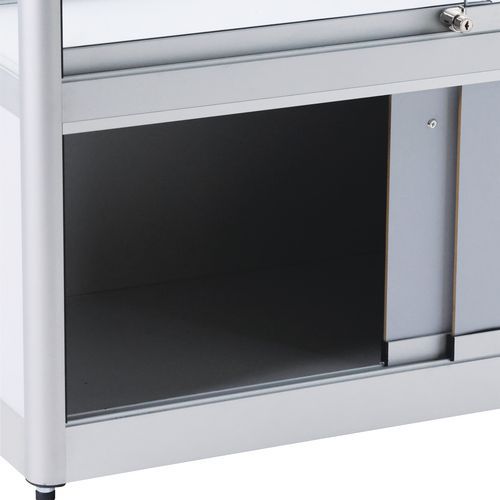 - Armoire basse avec 2 portes coulissantes verrouillables par serrure à cylindre.