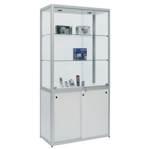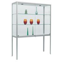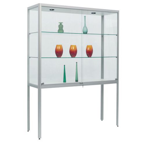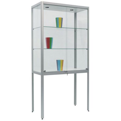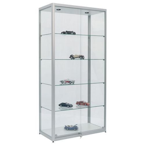 Vitrine d'exposition Factory, design avec de belle finition aluminium anodisé. Meuble de conception extra large et très profonde. Construction robuste: cadre spécial profilé aluminium. Vitrage extérieur de qualité avec verre sécurit trempé. Tablettes réglables en hauteur en verre sécurit trempé. Pieds-vérin ajustables en hauteur pour les modèles au sol. Éclairage LV et ballast électronique prêts à brancher. Dessus et bas : panneau de particules bois (y compris pour modèle avec portes)