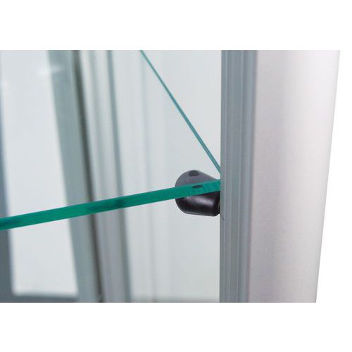 Vitrine d'exposition Factory, design avec de belle finition aluminium anodisé. Meuble de conception extra large et très profonde. Construction robuste: cadre spécial profilé aluminium. Vitrage extérieur de qualité avec verre sécurit trempé. Tablettes réglables en hauteur en verre sécurit trempé. Pieds-vérin ajustables en hauteur pour les modèles au sol. Éclairage LV et ballast électronique prêts à brancher. Dessus et bas : panneau de particules bois (y compris pour modèle avec portes) Fabriqué en UE Charge maxi par tablette (kg) : 10 Montage : À monter